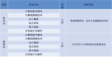 学校目前在校生1065人、24个教学班,现有教职工71人,目前开设网络技术、数字媒体、会计事务、电子商务、幼儿保育、艺术设计与制作共6个专业。现有教学仪器设备300万元、纸质图书36000余册;并斥资近40万元采购会计信息化教学平台,不断优化教学资源。